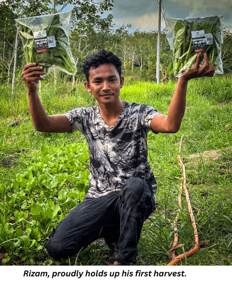 By mid-September 2025, Rizam planted his first crop: sawi Hong Kong (Hong Kong mustard greens). He adopted a small-scale approach to master the techniques of natural vegetable farming.